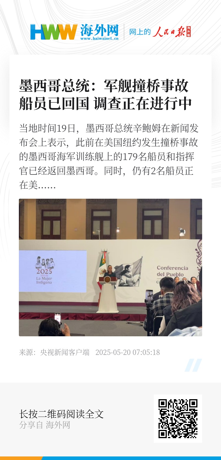 当地时间19日,墨西哥总统辛鲍姆在新闻发布会上表示,此前在美国纽约发生撞桥事故的墨西哥海军训练舰上的179名船员和指挥官已经返回墨西哥。同时,仍有2名船员正在美国纽约的医院接受救治,目前身体状况稳定。