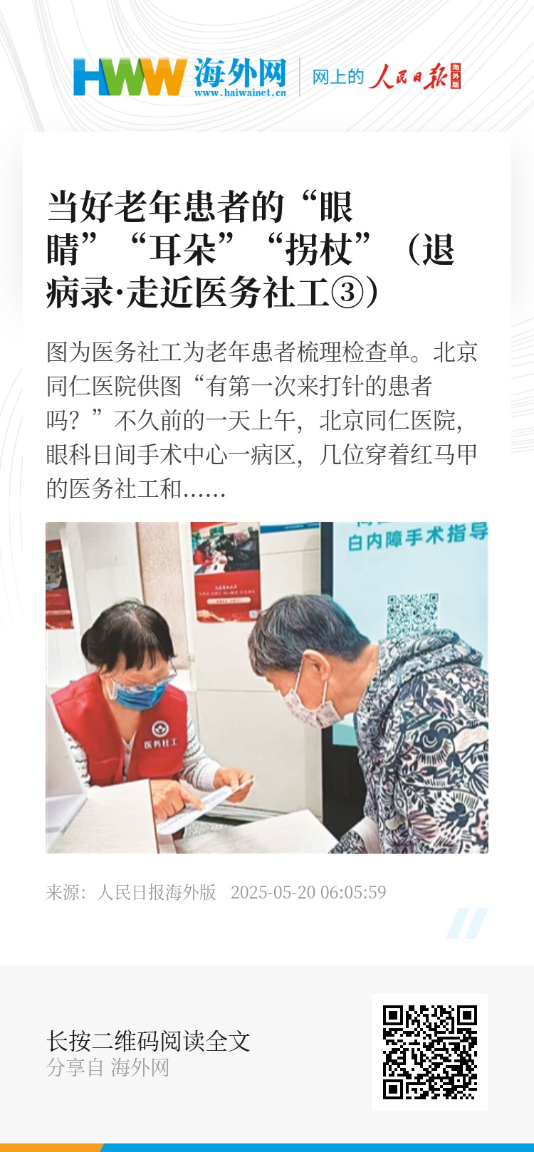 “基于医务社工的专业优势,我们实施了‘爱暮同行’项目,探索建立了‘医务社工+志愿者’的老年眼科患者陪诊模式,让医务社工和志愿者做他们的‘眼睛’‘耳朵’‘拐杖’。”北京同仁医院医患关系协调办公室(社工部)高级政工师韩霜雪说,“比如,来白内障中心分诊台咨询的老年患者,只要是超过80岁,或者超过60岁夫妻陪伴以及独自就诊的,医院专职医务社工和社会志愿者都会主动提供陪诊服务,让老年群体感受到医院的关注、关怀、关爱。”