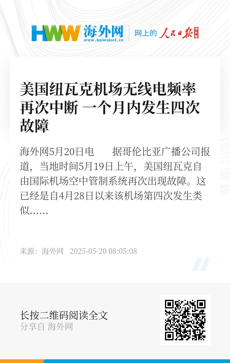 海外网5月20日电 据哥伦比亚广播公司报道,当地时间5月19日上午,美国纽瓦克自由国际机场空中管制系统再次出现故障。这已经是自4月28日以来该机场第四次发生类似事件。