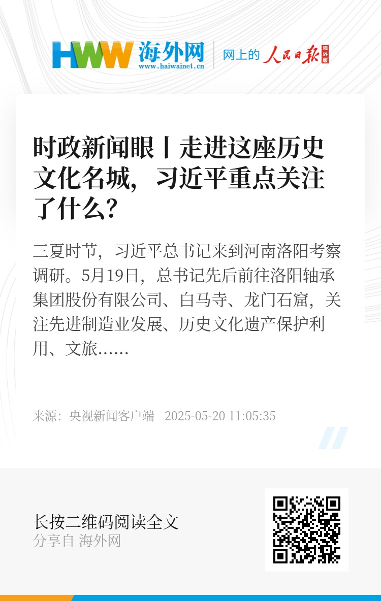 三夏时节,习近平总书记来到河南洛阳考察调研。5月19日,总书记先后前往洛阳轴承集团股份有限公司、白马寺、龙门石窟,关注先进制造业发展、历史文化遗产保护利用、文旅产业高质量发展等情况,既看经济发展“硬实力”,也看文化发展“软实力”。如何理解总书记此次洛阳之行蕴含的深意?《时政新闻眼》为你解读。