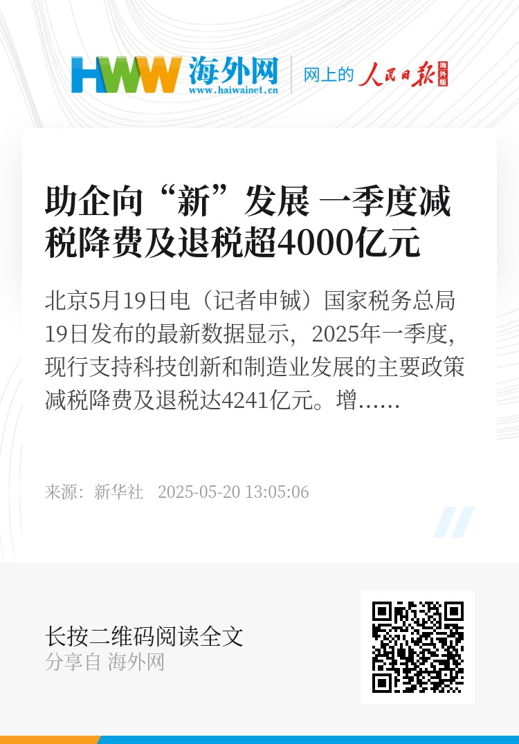 新华社北京5月19日电(记者申铖)国家税务总局19日发布的最新数据显示,2025年一季度,现行支持科技创新和制造业发展的主要政策减税降费及退税达4241亿元。