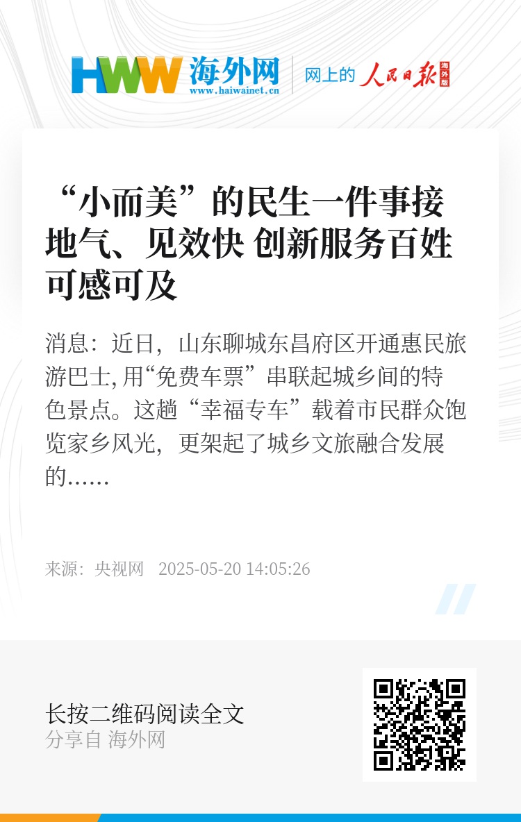 央视网消息:近日,山东聊城东昌府区开通惠民旅游巴士,用“免费车票” 串联起城乡间的特色景点。这趟“幸福专车”载着市民群众饱览家乡风光,更架起了城乡文旅融合发展的新桥梁。