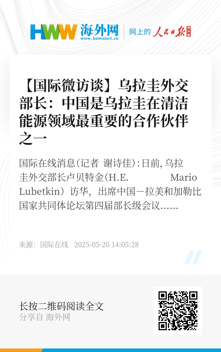 乌拉圭是清洁能源生产大国。卢贝特金在发布会上回答国际在线记者提问时介绍了乌拉圭清洁能源发展成果与优势,同时肯定了中国在能源开发领域的丰富经验,认为中国是乌拉圭“最重要的合作伙伴之一”。
