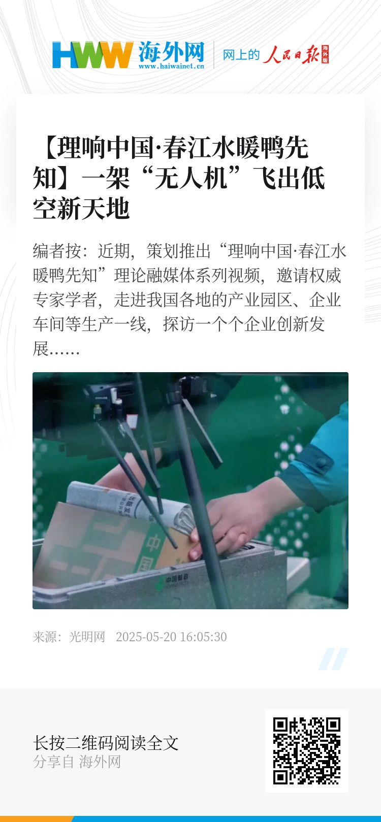 编者按:近期,光明网策划推出“理响中国·春江水暖鸭先知”理论融媒体系列视频,邀请权威专家学者,走进我国各地的产业园区、企业车间等生产一线,探访一个个企业创新发展的生动故事,共同探寻我国经济发展的新动能、好经验。本期视频,中国社会科学院经济研究所研究员张小溪走访安徽芜湖低空产业园,探寻当地如何在十来年间实现从“产业荒漠”到“创新雨林”的成功蜕变,如今不出产业园就能自主生产一架飞机。