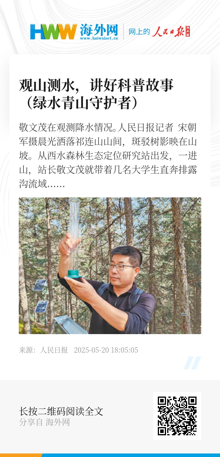 山中之林、林中之水、一草一木,这些都是敬文茂和同事们的日常观测对象。近年来,不少相关专业大学生、有参观学习需求的相关单位和团体来到西水森林生态定位研究站,听敬文茂讲述在祁连山深处观山测水的故事。去年8月,敬文茂被评为“全国科普工作先进工作者”。