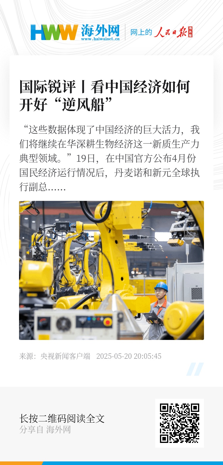 “这些数据体现了中国经济的巨大活力,我们将继续在华深耕生物经济这一新质生产力典型领域。”19日,在中国官方公布4月份国民经济运行情况后,丹麦诺和新元全球执行副总裁莫滕·拉斯穆森与《国际锐评》交流了看法。与此同时,国际媒体纷纷用“超预期”“有韧性”“保持定力”等评价中国经济表现。