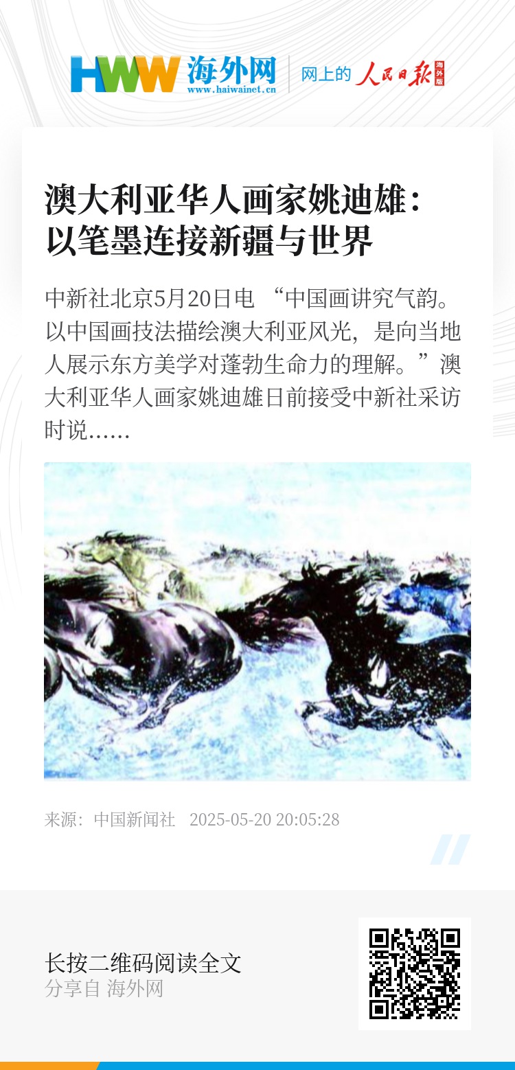 中新社北京5月20日电 “中国画讲究气韵。以中国画技法描绘澳大利亚风光,是向当地人展示东方美学对蓬勃生命力的理解。”澳大利亚华人画家姚迪雄日前接受中新社采访时说。