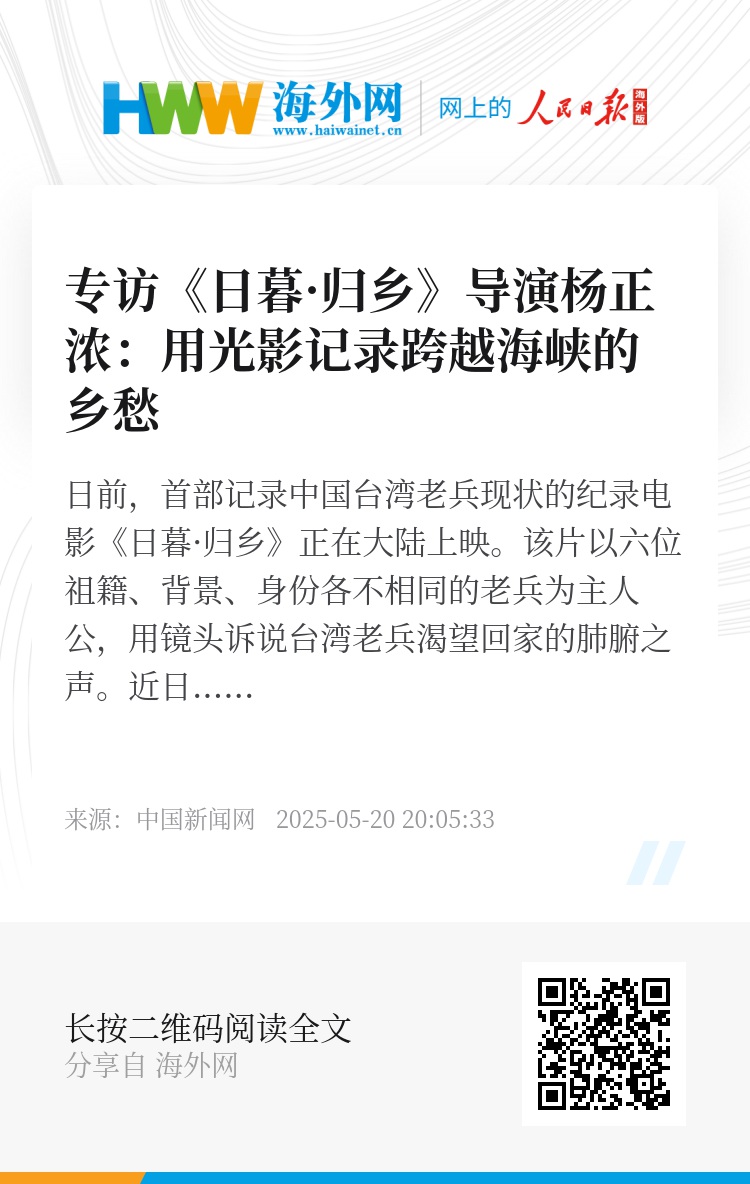 日前,首部记录中国台湾老兵现状的纪录电影《日暮·归乡》正在大陆上映。该片以六位祖籍、背景、身份各不相同的老兵为主人公,用镜头诉说台湾老兵渴望回家的肺腑之声。近日,该片导演杨正浓接受中新社专访,回忆创作的心路历程。