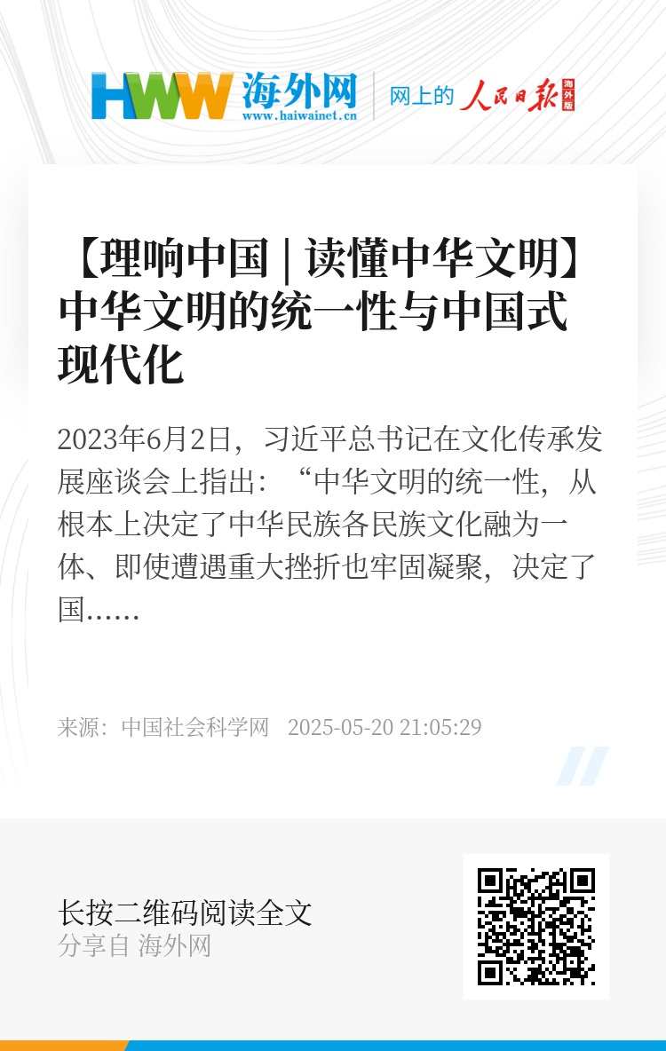 2023年6月2日,习近平总书记在文化传承发展座谈会上指出:“中华文明的统一性,从根本上决定了中华民族各民族文化融为一体、即使遭遇重大挫折也牢固凝聚,决定了国土不可分、国家不可乱、民族不可散、文明不可断的共同信念,决定了国家统一永远是中国核心利益的核心,决定了一个坚强统一的国家是各族人民的命运所系。”在中国传统文化中,“天下大同”价值理念根植于中华民族追求“统一”的传统文化,铸就了多民族国家的共同社会理想。统一性启示我们凝心聚力,在全面建设社会主义现代化国家新征程中作出新的更大的贡献。
