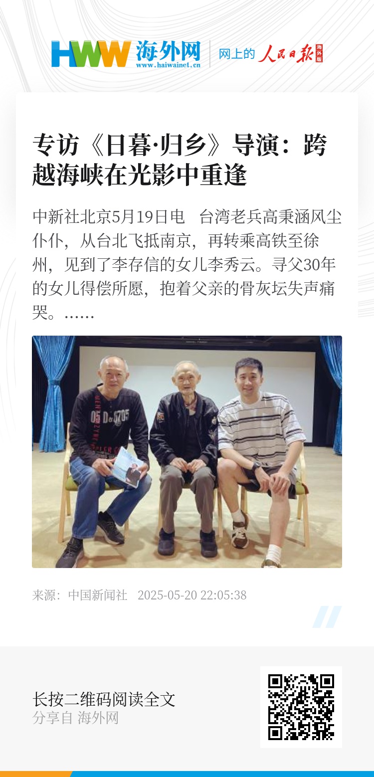 “《日暮·归乡》的意义,不仅仅是让观众记住苦难,而是让他们看见两岸血浓于水的羁绊。”导演说,影片的底色是温暖的,“镜头里有老兵的泪水,也有他们终于‘归乡’的曙光。所有跨越岁月的追寻,最终通向希望。”