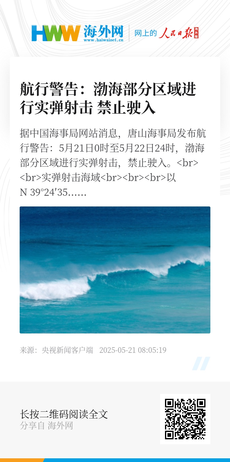 据中国海事局网站消息,唐山海事局发布航行警告:5月21日0时至5月22日24时,渤海部分区域进行实弹射击,禁止驶入。