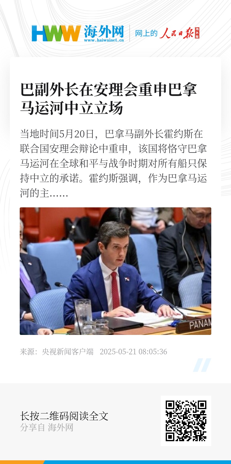 当地时间5月20日,巴拿马副外长霍约斯在联合国安理会辩论中重申,该国将恪守巴拿马运河在全球和平与战争时期对所有船只保持中立的承诺。