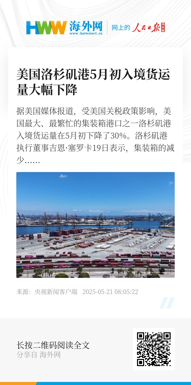 据美国媒体报道,受美国关税政策影响,美国最大、最繁忙的集装箱港口之一洛杉矶港入境货运量在5月初下降了30%。洛杉矶港执行董事吉恩·塞罗卡19日表示,集装箱的减少意味着港口的工作量减少,从卡车司机、港口工人等数量可以看出,在5月的第一周,这种影响几乎立即显现出来。