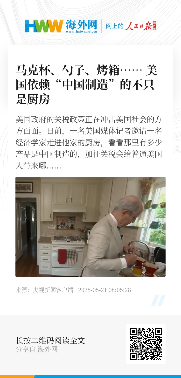 美国政府的关税政策正在冲击美国社会的方方面面。日前,一名美国媒体记者邀请一名经济学家走进他家的厨房,看看那里有多少产品是中国制造的,加征关税会给普通美国人带来哪些影响?