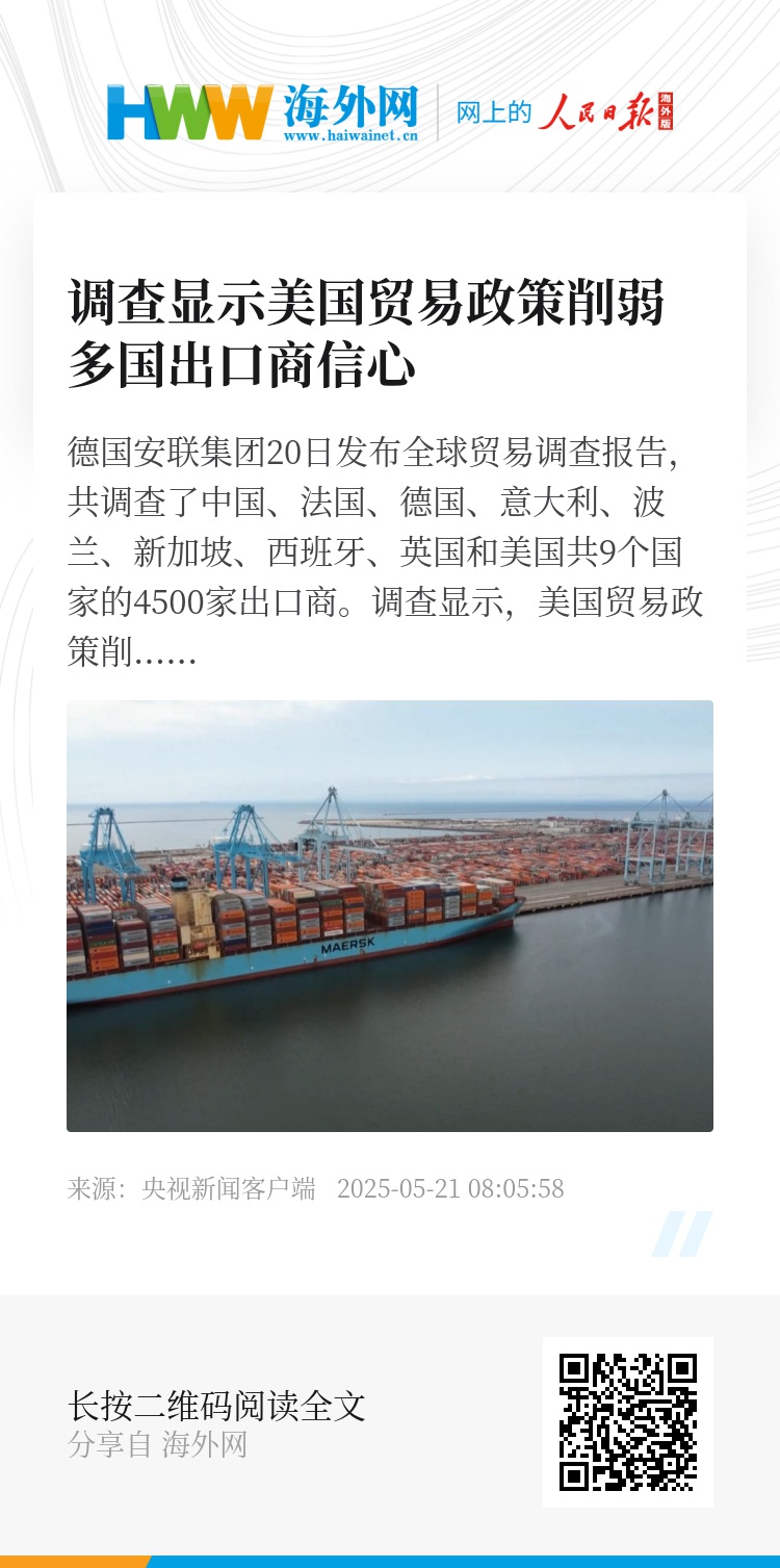 德国安联集团20日发布全球贸易调查报告,共调查了中国、法国、德国、意大利、波兰、新加坡、西班牙、英国和美国共9个国家的4500家出口商。调查显示,美国贸易政策削弱多国出口商信心。