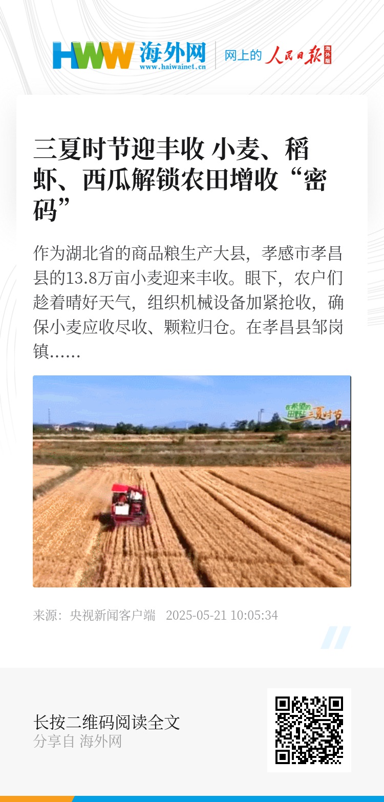作为湖北省的商品粮生产大县, 孝感市孝昌县的13.8万亩小麦迎来丰收。眼下,农户们趁着晴好天气,组织机械设备加紧抢收,确保小麦应收尽收、颗粒归仓。