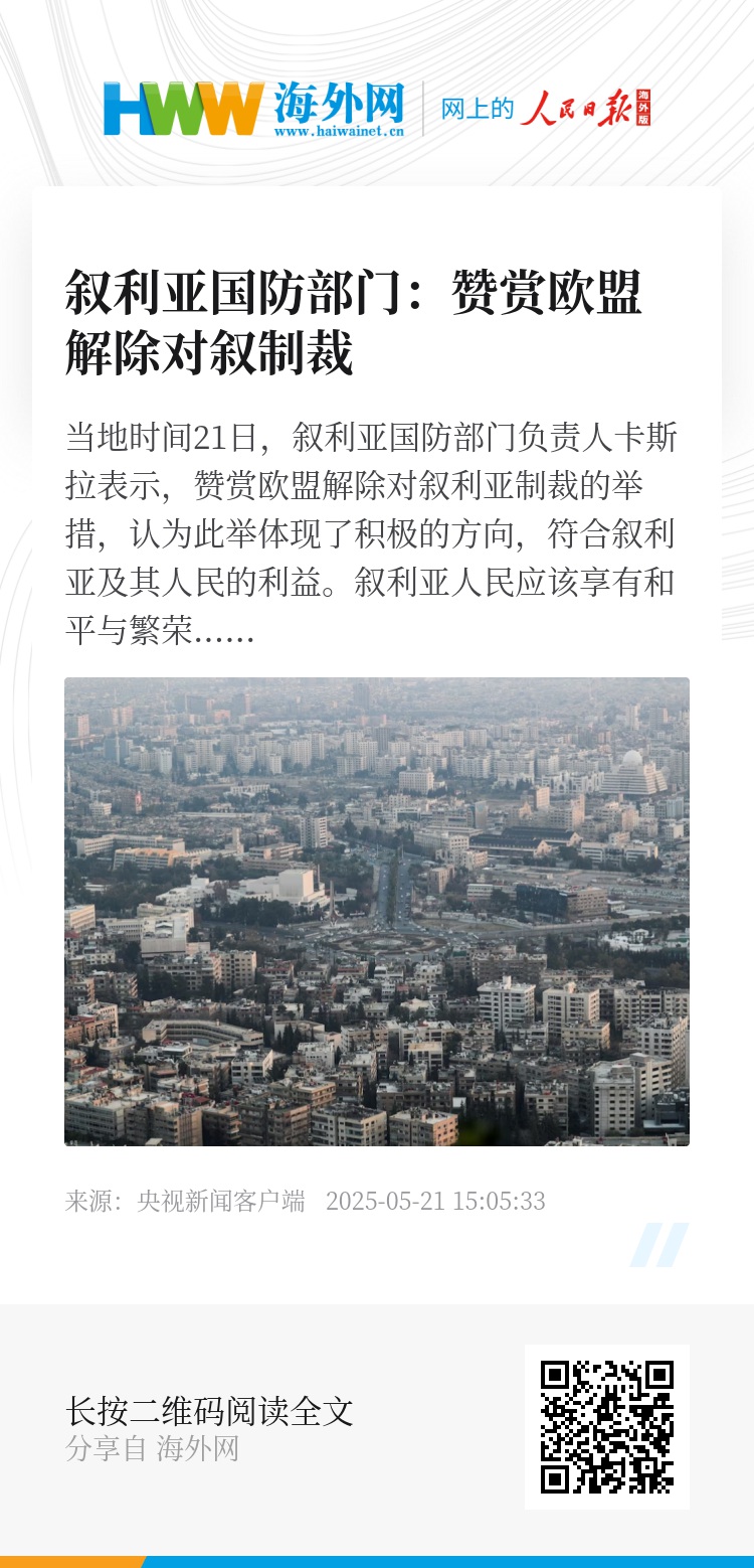 本月20日,欧盟理事会发表声明宣布解除对叙利亚的经济制裁。声明说,欧盟将继续与叙利亚过渡政府保持接触,密切关注叙局势变化,以及取消对叙经济制裁这一决定的影响。(总台记者 王薇薇)