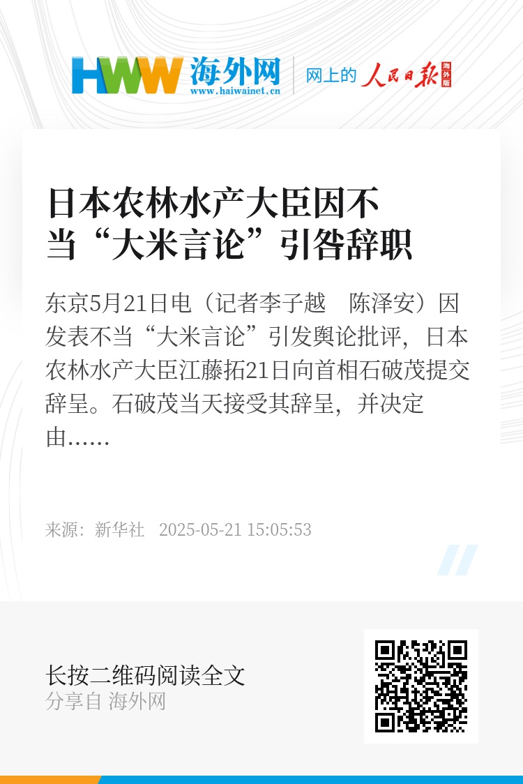 目前,日本大米价格相较去年同期已近翻倍。多家日本媒体指出,江藤拓的不当言论被认为是漠视民意,加剧了舆论对政府的批评,可能对执政党在今年夏季参议院选举中的选情不利。
