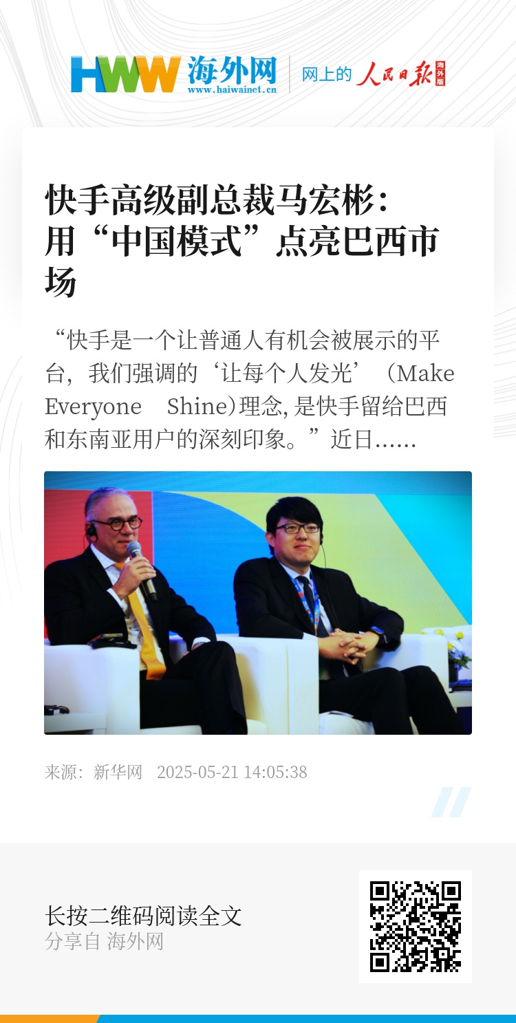 “快手是一个让普通人有机会被展示的平台,我们强调的‘让每个人发光’(Make Everyone Shine)理念,是快手留给巴西和东南亚用户的深刻印象。”近日,在北京举行的中国-巴西商业研讨会上,快手高级副总裁、快手国际化业务负责人马宏彬接受记者专访时说到。