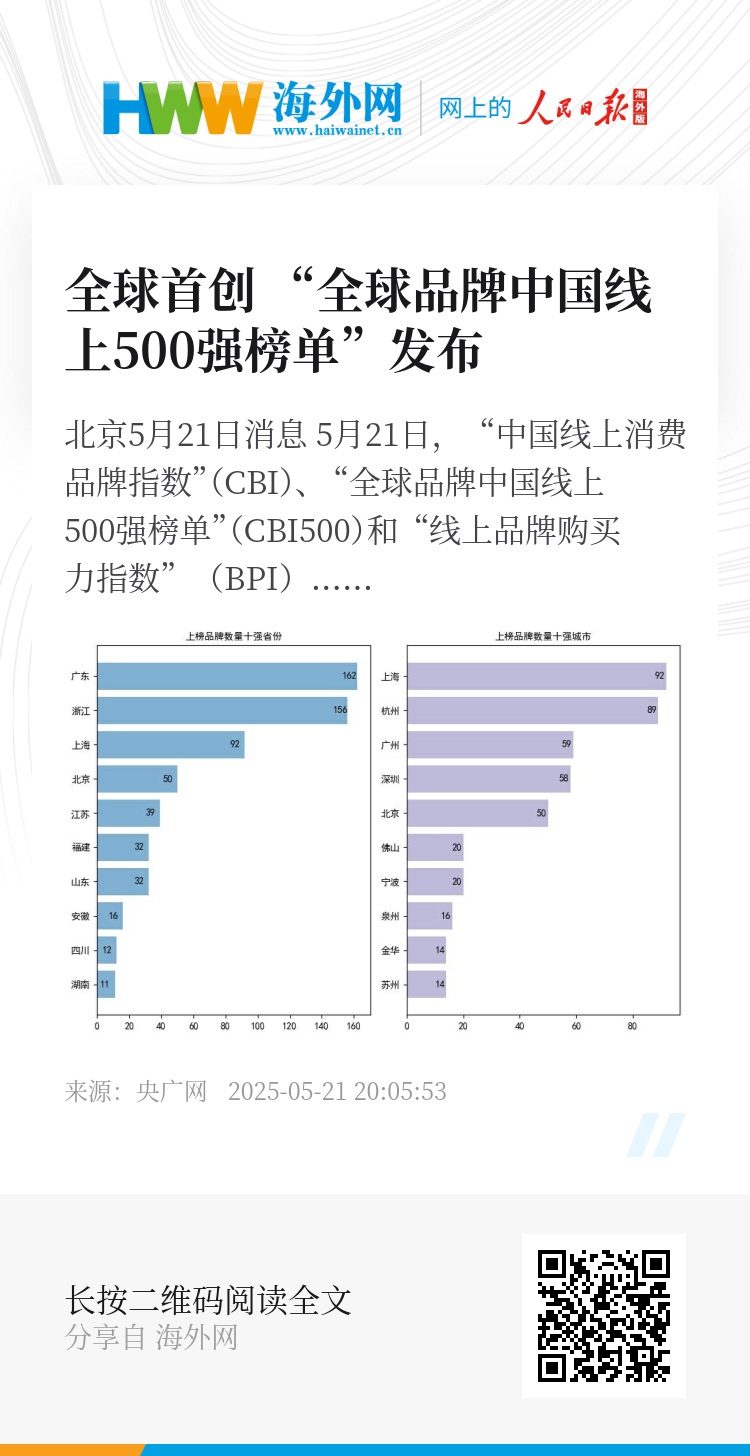 央广网北京5月21日消息 5月21日,“中国线上消费品牌指数”(CBI)、 “全球品牌中国线上500强榜单”(CBI500)和 “线上品牌购买力指数”(BPI)发布。“中国线上消费品牌指数”(CBI)是全球首个以真实消费大数据为基础、聚焦高质量发展的线上消费指数,不仅在全国层面提供各季度的总指数,还为各地级市、各行业提供细分指数。“全球品牌中国线上500强榜单”(CBI500)是全球首个完全基于消费者实际购买行为的品牌榜单。