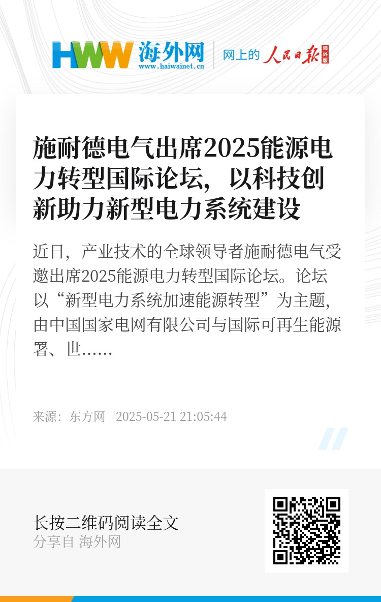 近日,产业技术的全球领导者施耐德电气受邀出席2025能源电力转型国际论坛。论坛以“新型电力系统加速能源转型”为主题,由中国国家电网有限公司与国际可再生能源署、世界能源理事会、世界经济论坛共同举办,10家全球知名电力企业联合主办。施耐德电气围绕能源转型、新型电力系统建设以及城市电网零碳转型等关键议题,与产业各界共同探讨创新路径,并展示其在能源电力领域的技术与解决方案,助力产业迈向高效、可持续未来。