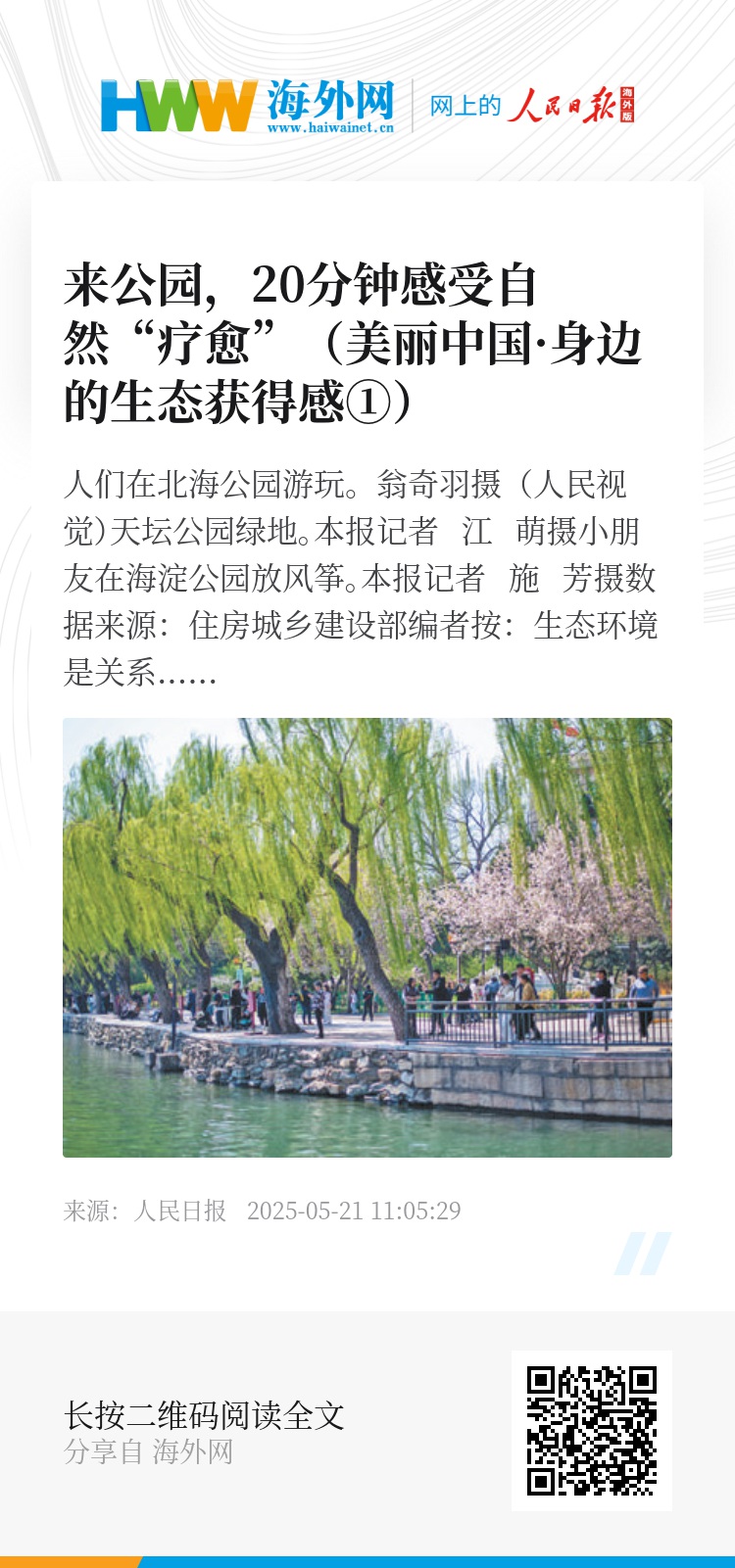“去公园转了20分钟,神清气爽”“大自然真是个巨大的能量场”……社交媒体上,“公园20分钟效应”火了。