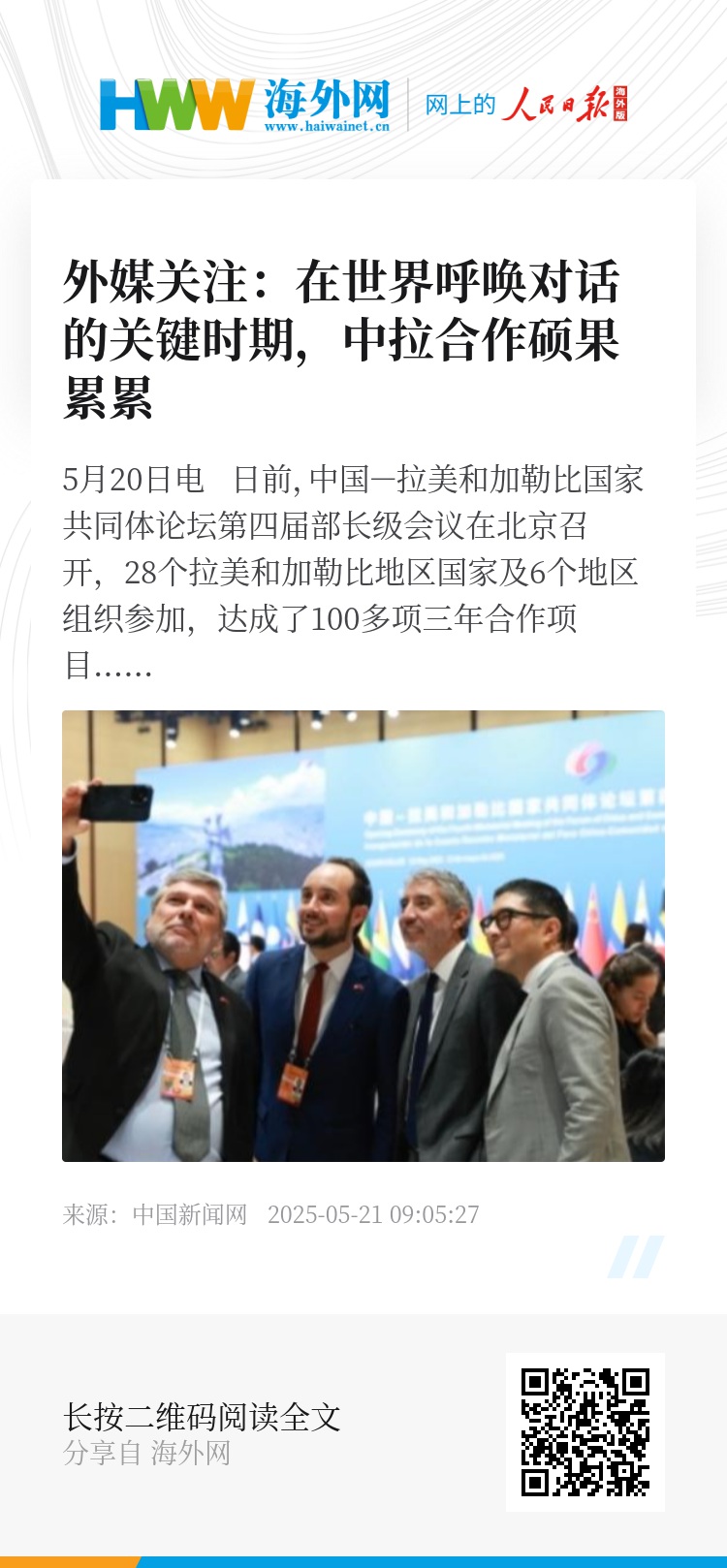 中新网5月20日电 日前,中国-拉美和加勒比国家共同体论坛第四届部长级会议在北京召开,28个拉美和加勒比地区国家及6个地区组织参加,达成了100多项三年合作项目。对此,多家外媒发文关注中拉论坛成立10年来的丰硕成果,称赞中拉合作硕果累累,多边务实合作造福世界。