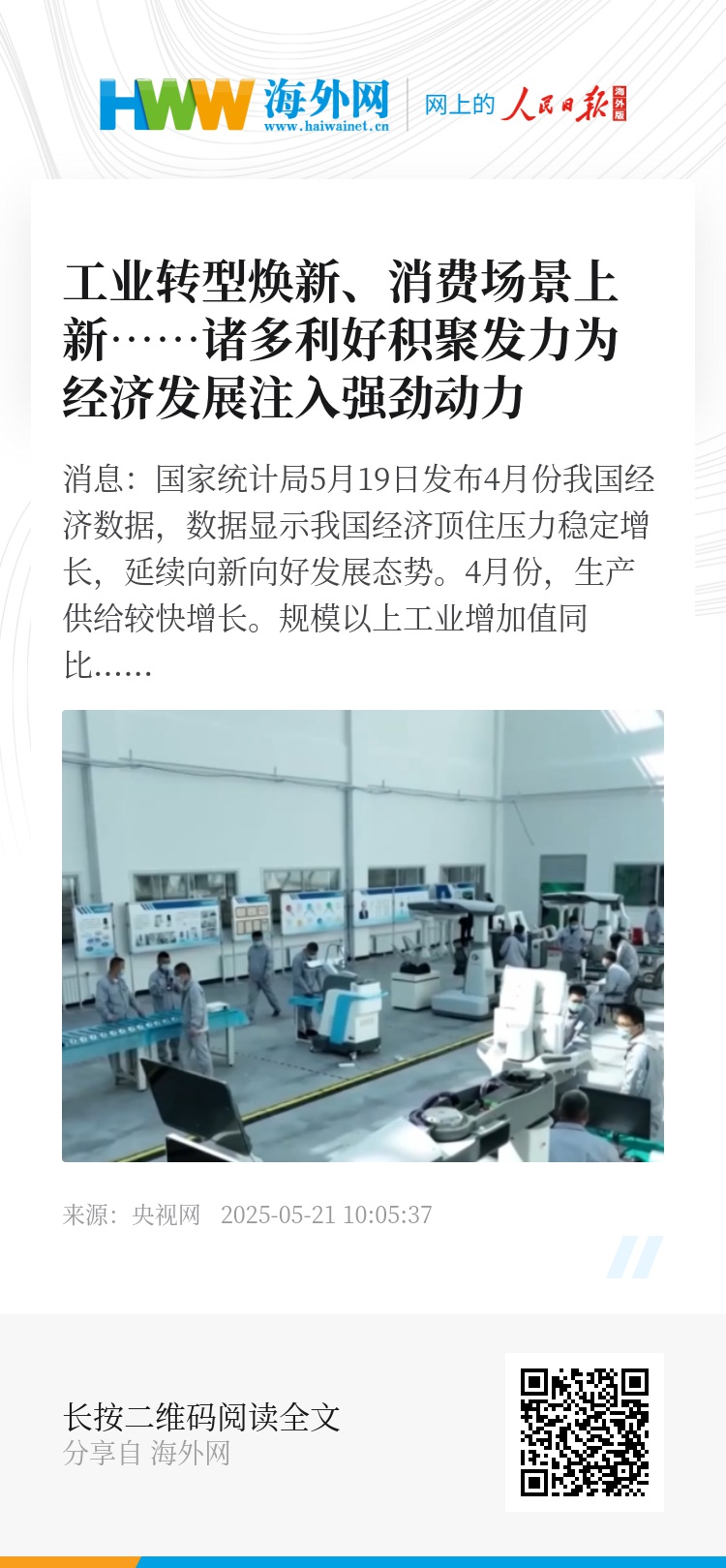 央视网消息:国家统计局5月19日发布4月份我国经济数据,数据显示我国经济顶住压力稳定增长,延续向新向好发展态势。