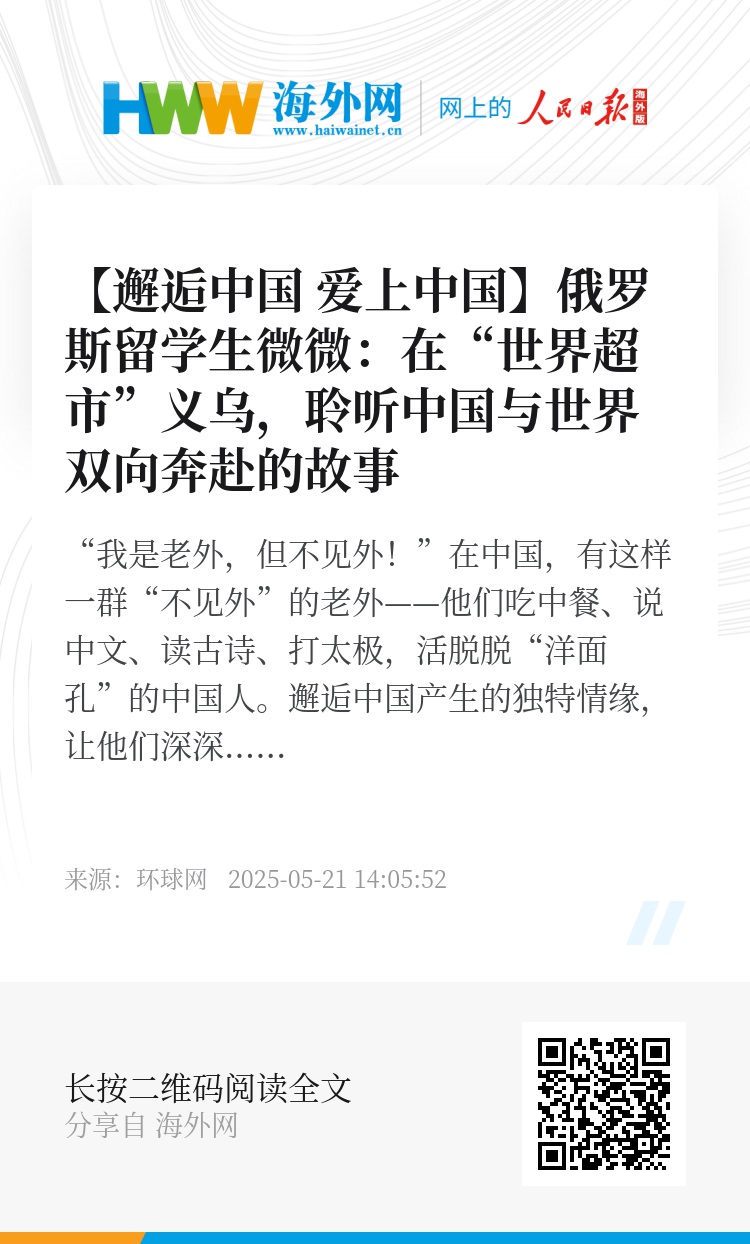 “我是老外,但不见外!”在中国,有这样一群“不见外”的老外——他们吃中餐、说中文、读古诗、打太极,活脱脱“洋面孔”的中国人。邂逅中国产生的独特情缘,让他们深深爱上了中国。环球网“环聚一堂”工作室推出“邂逅中国 爱上中国”——老外不见外系列短视频栏目,讲述“不见外”的老外的生动故事,以外国人视角真实展现经济腾飞、社会巨变、绿水青山的新时代中国。今日,本网播发第十四期短视频:《俄罗斯留学生微微:在“世界超市”义乌,聆听中国与世界双向奔赴的故事》。