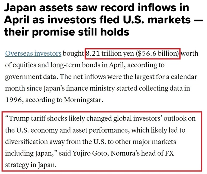 值得注意的是,在日本对美投资可能被“吓退”的同时,“逃离”美国的资金正大量涌向日本。