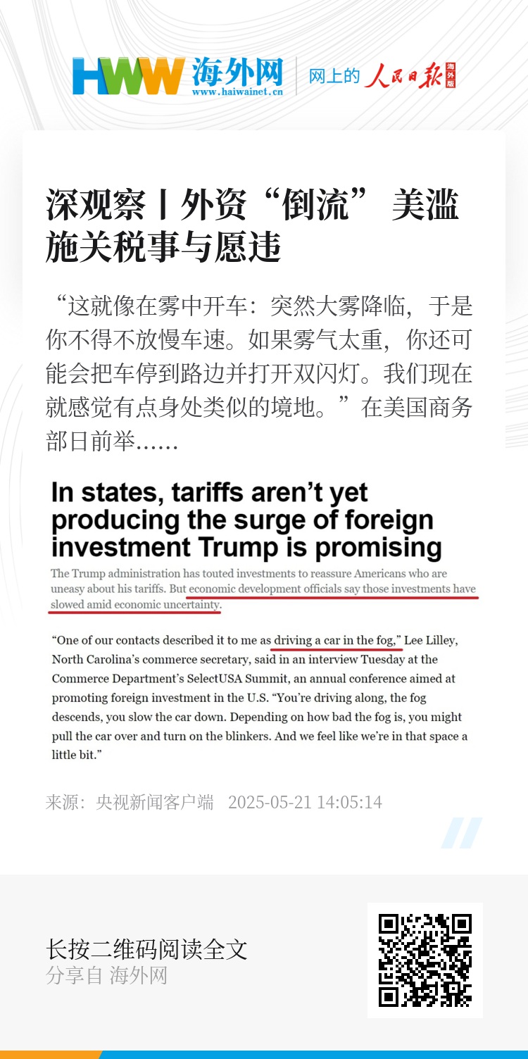 美国政府一直宣称,加征关税将为美国吸引数万亿美元的外国投资。但据美国《政治报》报道,来自美国多个州的政府官员和议员都抱怨说,白宫关税政策引发的不确定性正在阻碍外资进入美国市场。