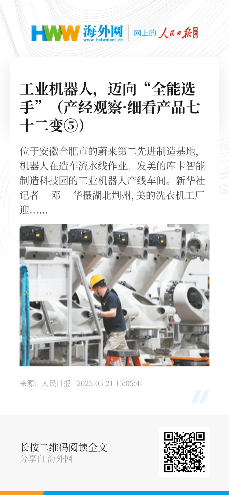 湖北荆州,美的洗衣机工厂迎来美的人形机器人,从事巡检、机器运维、设备检修等工作;德国汉诺威,上海节卡智能协作机器人亮相工业博览会,展示了轻捏薯片级别的控制能力,引得众多观众体验;北京极智嘉的机器人智能仓储系统打入西门子等全球大客户供应链……今天,中国的工业机器人产品已在千行百业深度应用、不断成长。