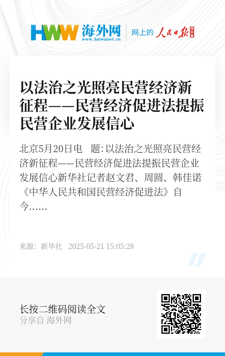 《中华人民共和国民营经济促进法》自今年5月20日起施行。