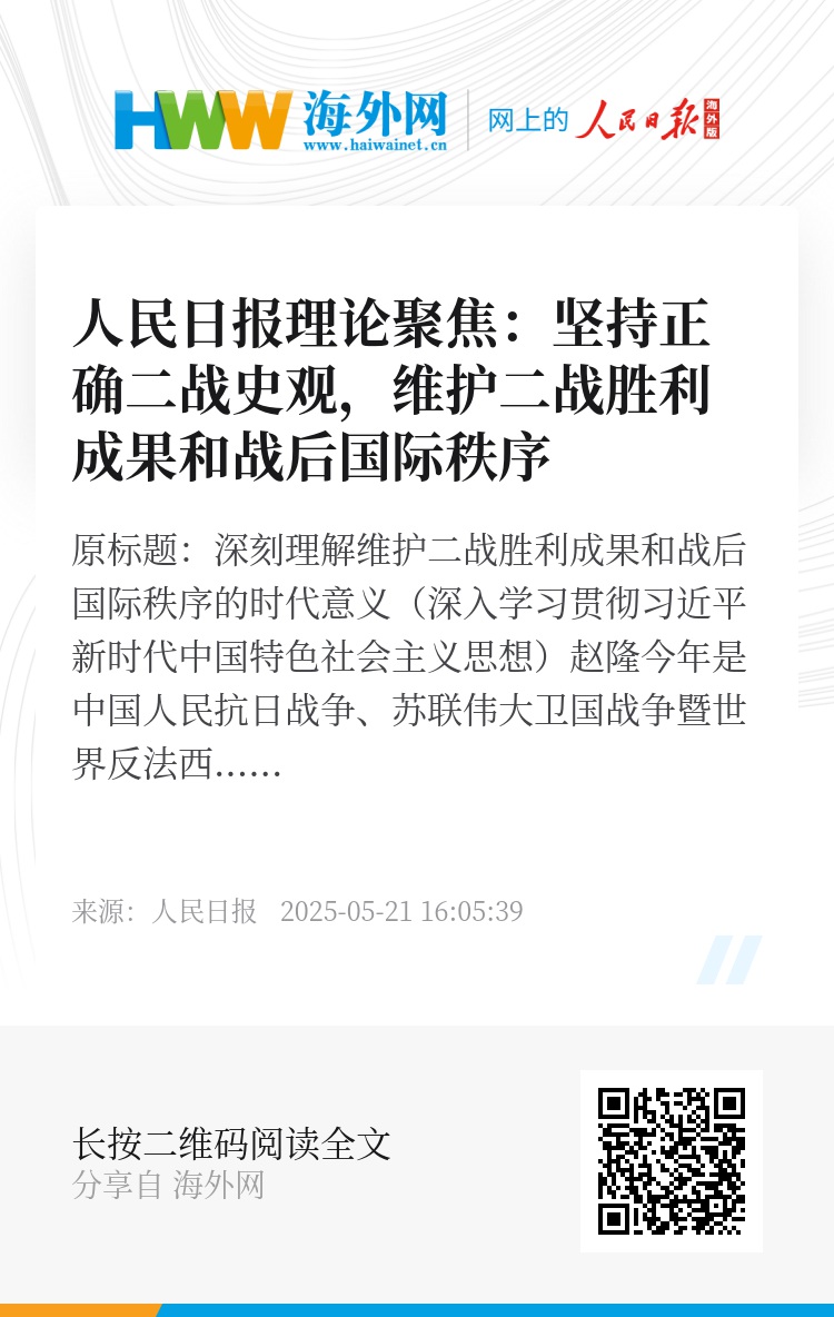 二战的胜利是人类正义力量的伟大胜利,是正义战胜邪恶、光明战胜黑暗的象征,为世界带来了和平与发展的曙光。正确看待二战历史,就要坚持正确二战史观,坚定捍卫历史正义。二战胜利这一共同的历史记忆,不仅是中苏两国并肩作战反抗日本军国主义与德国法西斯主义的生动写照,也是整个国际社会为追求和平而付出巨大牺牲的宝贵历史遗产,理应得到全人类的共同呵护与尊重。俄罗斯著名历史学家克柳切夫斯基说:“如果丧失对历史的记忆,我们的心灵就会在黑暗中迷失。”坚持正确二战史观,守护共同的二战历史记忆具有重大历史意义。令人遗憾的是,在中国人民抗日战争和世界反法西斯战争胜利80年后的今天,仍然有少数人无视铁的历史事实,无视在战争中牺牲的数千万计的无辜生命,逆历史潮流而动,一再否认甚至美化侵略历史,引起了包括中国人民在内的全世界爱好和平人民的强烈谴责。