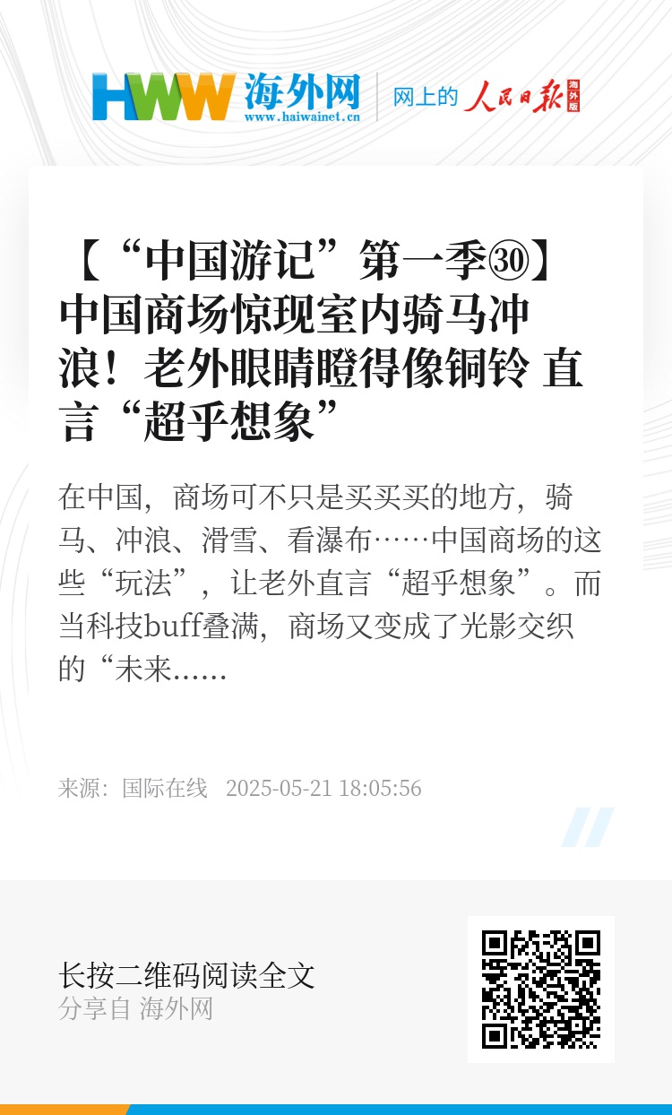 在中国,商场可不只是买买买的地方,骑马、冲浪、滑雪、看瀑布……中国商场的这些“玩法”,让老外直言“超乎想象”。而当科技buff叠满,商场又变成了光影交织的“未来空间站”,让外国友人惊呼“好像登上了宇宙飞船”!