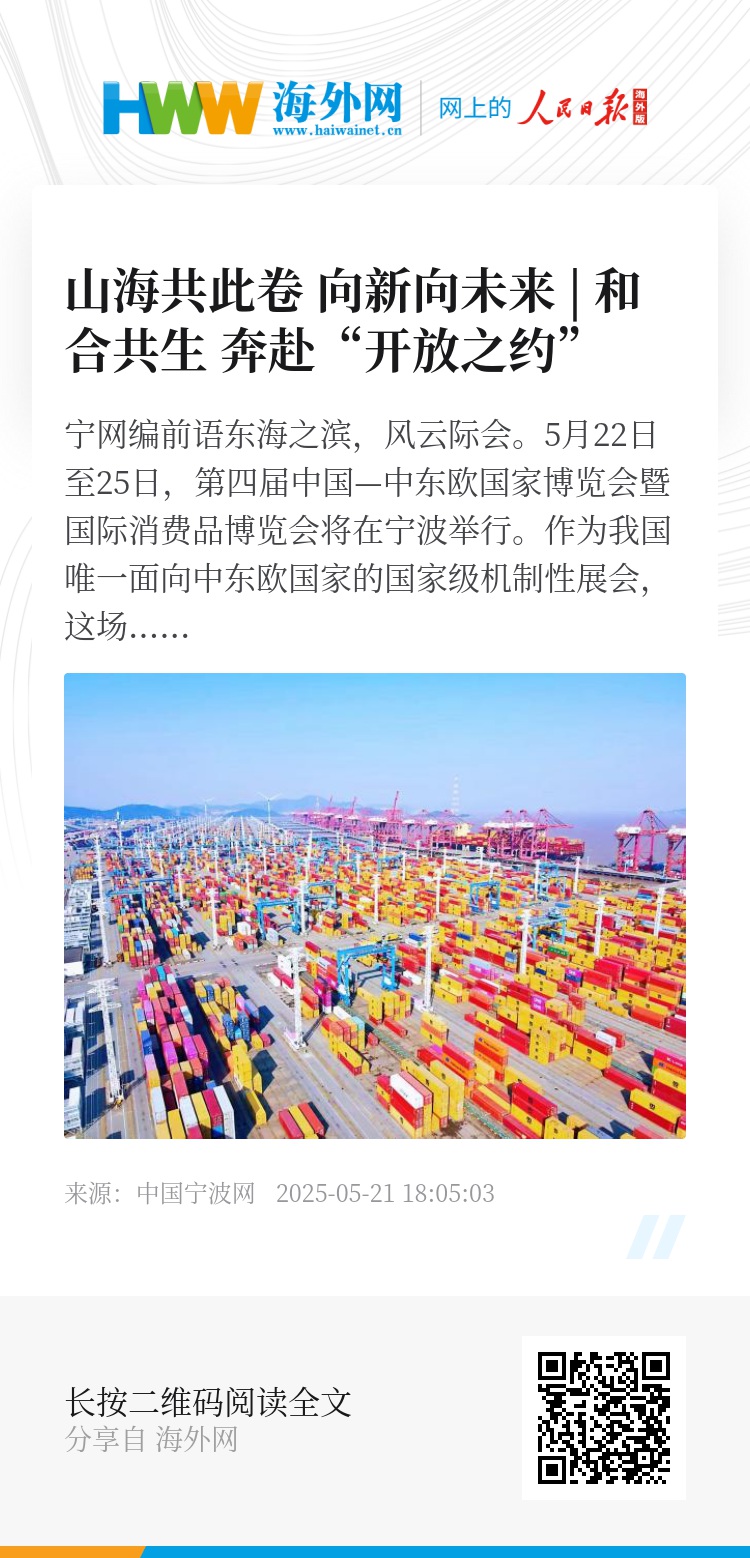 从商贸往来到双向投资,从人文互鉴到规则对接,宁波正以开放之姿搭建中国与中东欧国家深度合作的“大平台”,在百年变局中书写更高水平对外开放的崭新答卷。