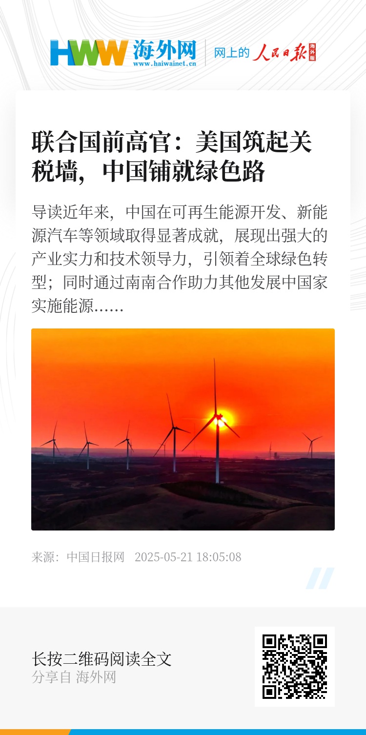 近年来,中国在可再生能源开发、新能源汽车等领域取得显著成就,展现出强大的产业实力和技术领导力,引领着全球绿色转型;同时通过南南合作助力其他发展中国家实施能源转型项目。当前美国政府在对外援助和气候环境政策方面出现倒退,并出台保护主义关税政策冲击全球绿色发展进程。在此情况下,中国应继续践行多边主义,通过技术转移和知识分享深化绿色合作,推进全球可持续发展。