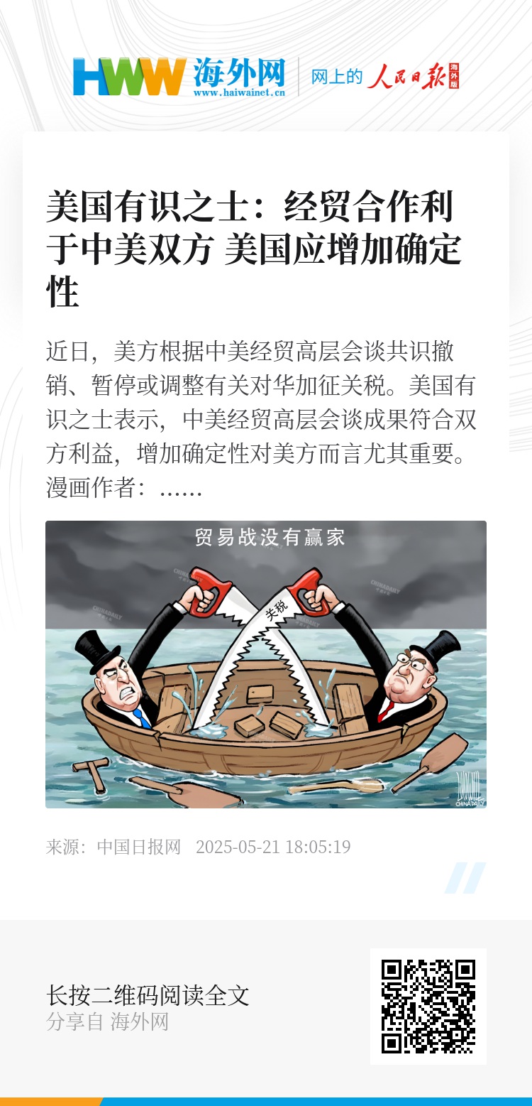 近日,美方根据中美经贸高层会谈共识撤销、暂停或调整有关对华加征关税。美国有识之士表示,中美经贸高层会谈成果符合双方利益,增加确定性对美方而言尤其重要。