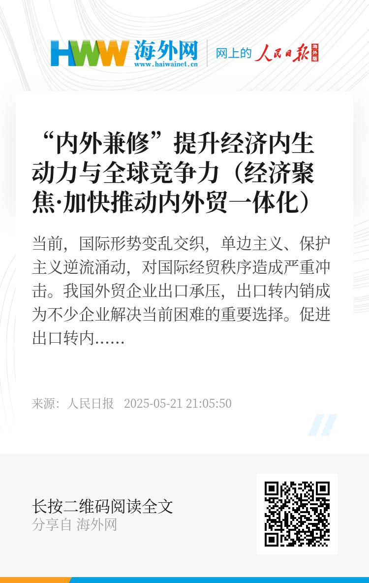 郭迎锋:推动内外贸一体化发展,是我国构建新发展格局的战略选择。通过激活内需、升级产业、搭建内外循环的“连接器”,内外贸一体化发展正在提升中国经济的内生动力与全球竞争力。未来,随着市场一体化发展、制度衔接和产业融合,“内外兼修”将成为我国高质量发展的一个显著特征。