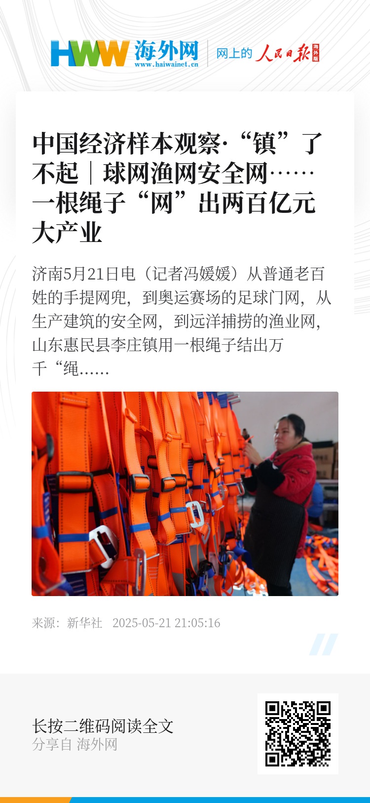 新华社济南5月21日电(记者冯媛媛)从普通老百姓的手提网兜,到奥运赛场的足球门网,从生产建筑的安全网,到远洋捕捞的渔业网,山东惠民县李庄镇用一根绳子结出万千“绳网”,“网”罗天下,成就了一个200亿元的“绳网”产业。