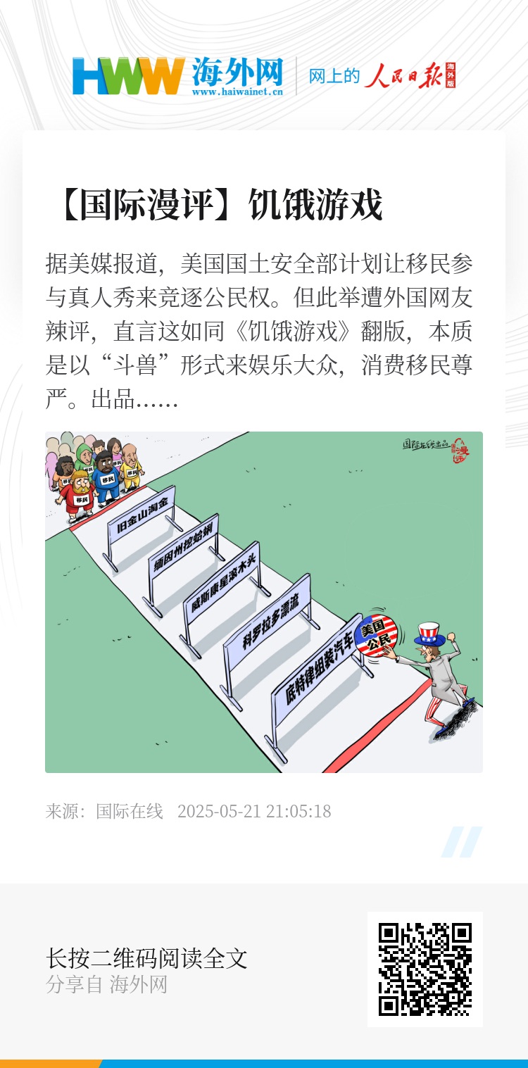 据美媒报道,美国国土安全部计划让移民参与真人秀来竞逐公民权。但此举遭外国网友辣评,直言这如同《饥饿游戏》翻版,本质是以“斗兽”形式来娱乐大众,消费移民尊严。