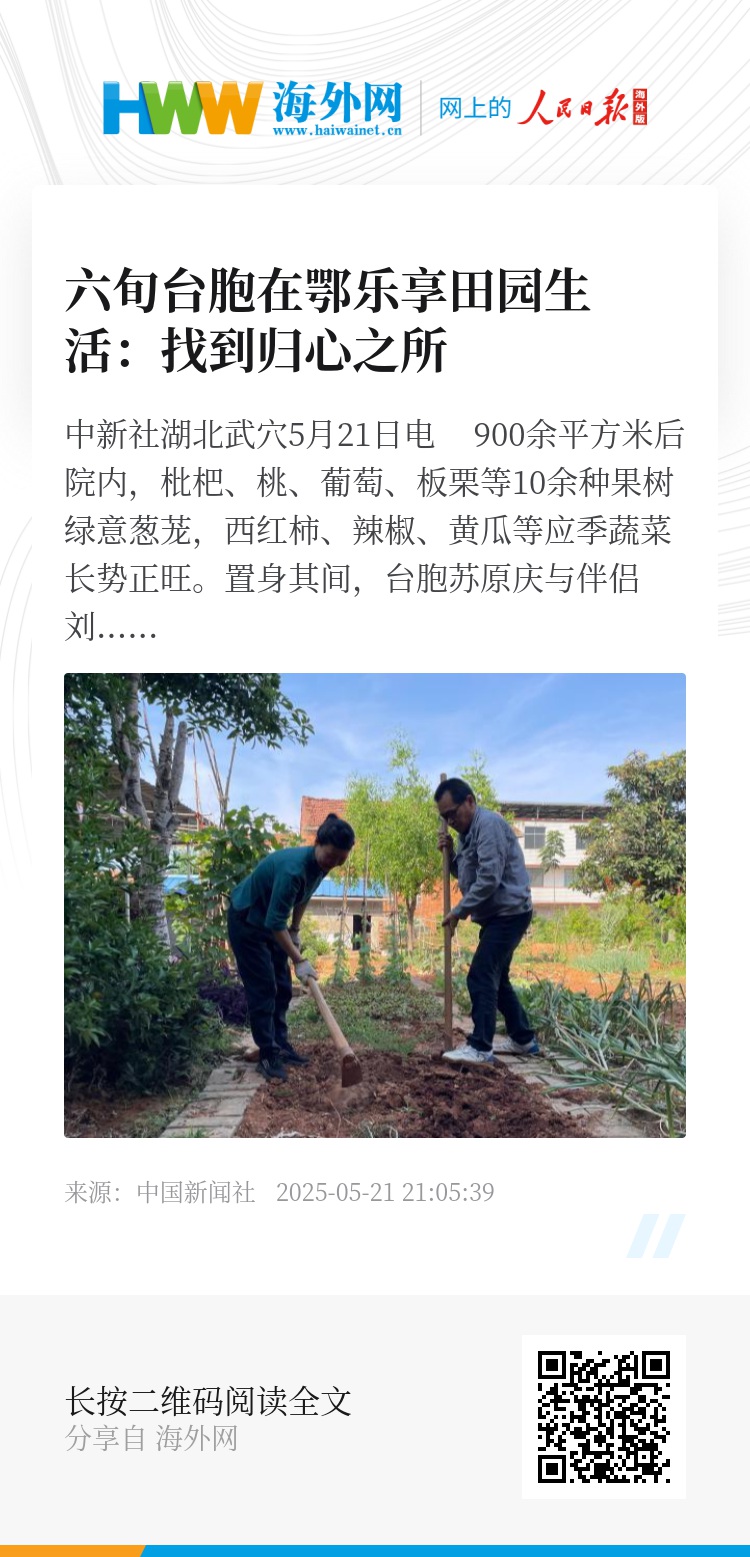 中新社湖北武穴5月21日电 900余平方米后院内,枇杷、桃、葡萄、板栗等10余种果树绿意葱茏,西红柿、辣椒、黄瓜等应季蔬菜长势正旺。置身其间,台胞苏原庆与伴侣刘保芳,分执二胡、古筝,合奏《渔舟唱晚》。