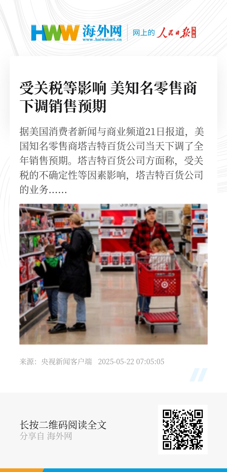据美国消费者新闻与商业频道21日报道,美国知名零售商塔吉特百货公司当天下调了全年销售预期。塔吉特百货公司方面称,受关税的不确定性等因素影响,塔吉特百货公司的业务受到损害。报道称,该公司第一季度的收益和收入均低于预期。