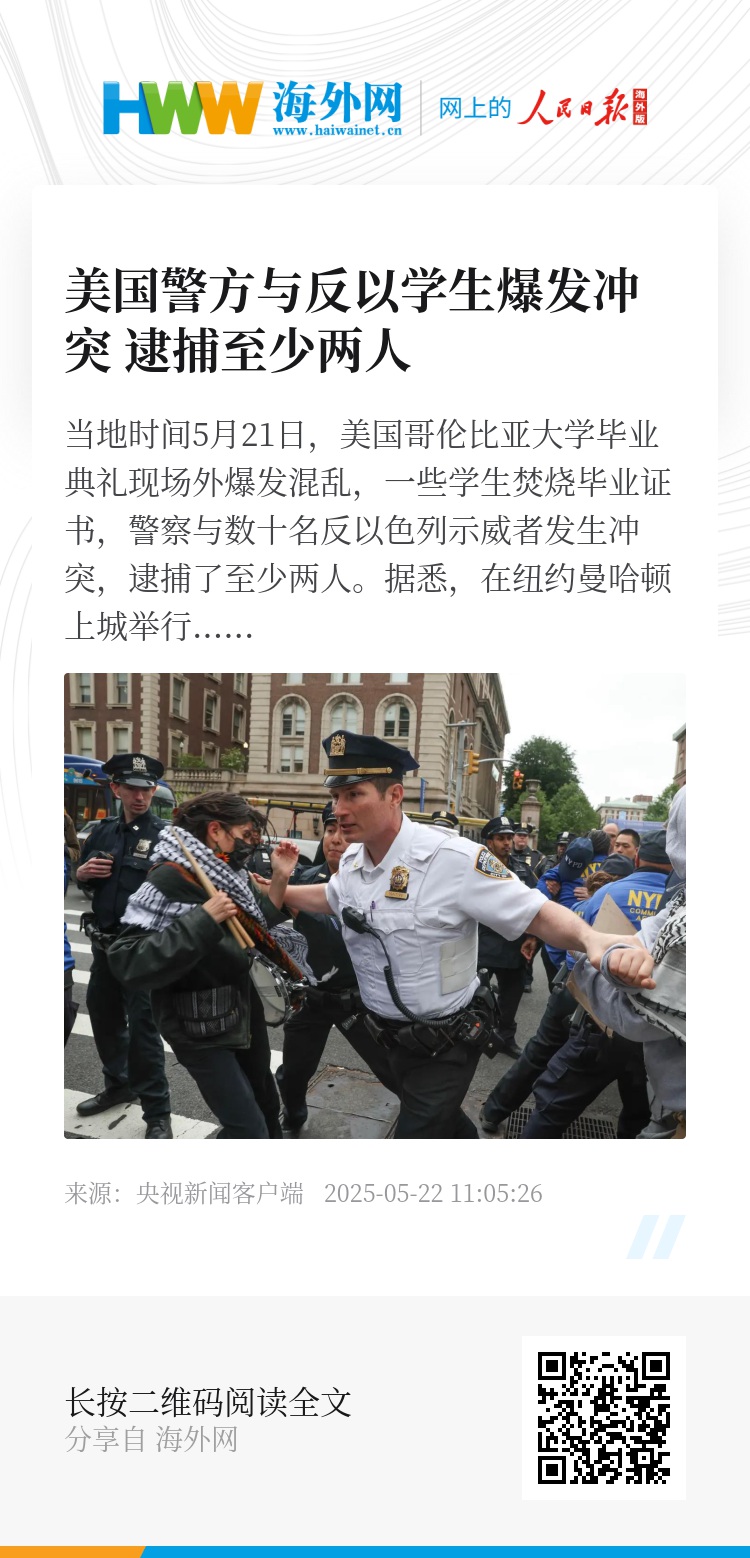 当地时间5月21日,美国哥伦比亚大学毕业典礼现场外爆发混乱,一些学生焚烧毕业证书,警察与数十名反以色列示威者发生冲突,逮捕了至少两人。