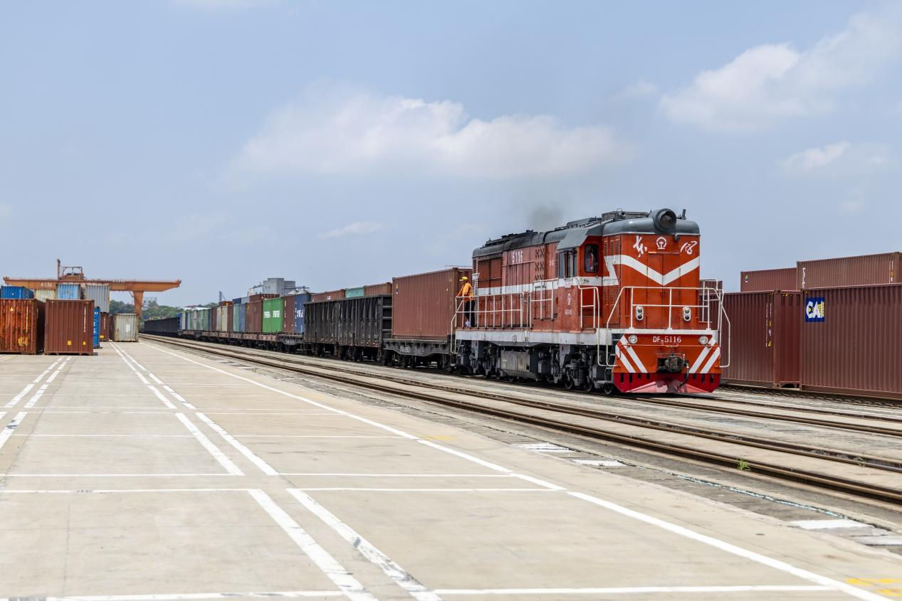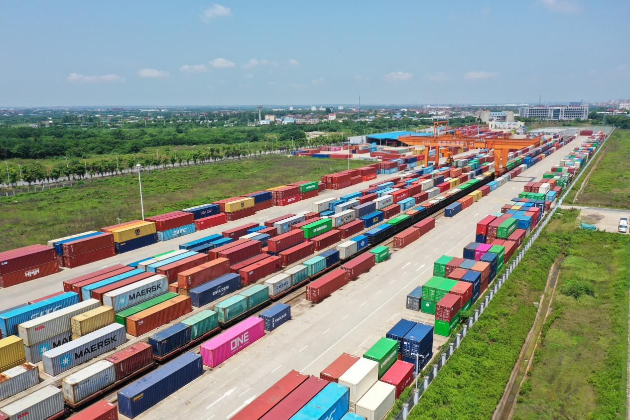 满载货物的铁海联运外贸班列正驶出南昌国际陆港。王剑 摄