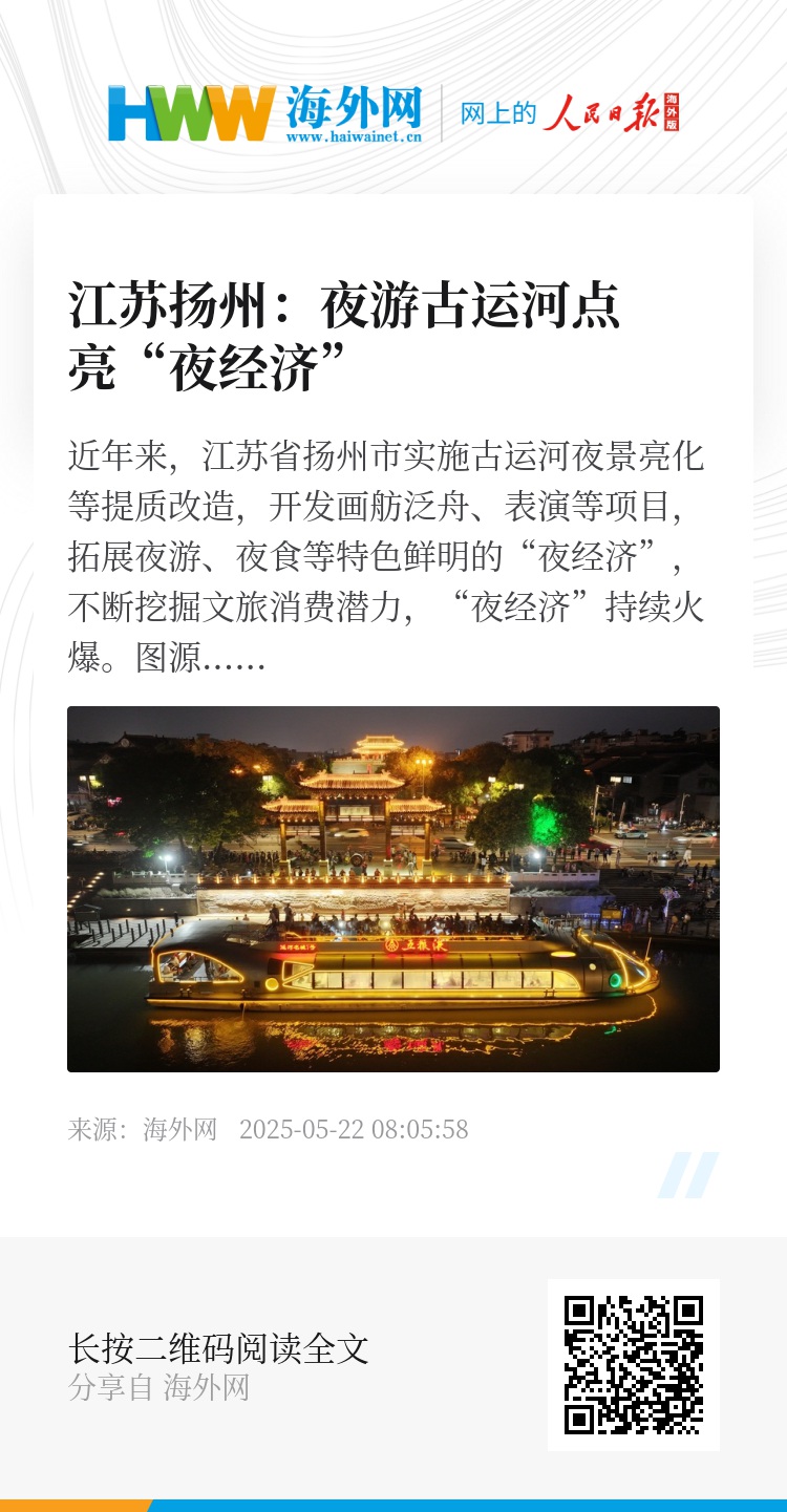 近年来,江苏省扬州市实施古运河夜景亮化等提质改造,开发画舫泛舟、表演等项目,拓展夜游、夜食等特色鲜明的“夜经济”,不断挖掘文旅消费潜力,“夜经济”持续火爆。图源:IC photo