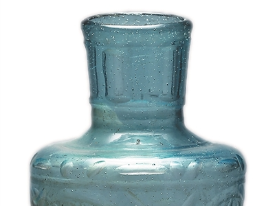 浅蓝色刻花玻璃瓶通体透明光洁,直颈,折肩,筒形腹,平底,颈、腹和底部均有几何花纹。其器形和纹饰均为10世纪伊斯兰玻璃器的流行样式。