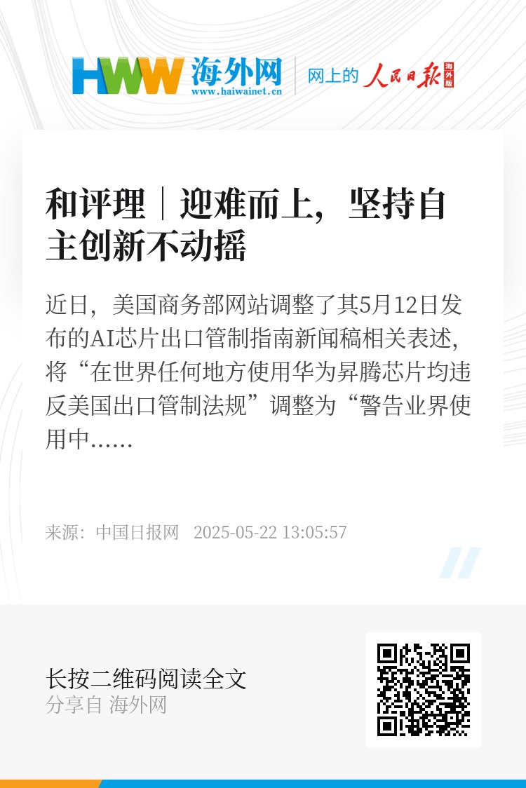 近日,美国商务部网站调整了其5月12日发布的AI芯片出口管制指南新闻稿相关表述,将“在世界任何地方使用华为昇腾芯片均违反美国出口管制法规”调整为“警告业界使用中国先进计算机芯片,包括特定华为昇腾芯片的风险”。