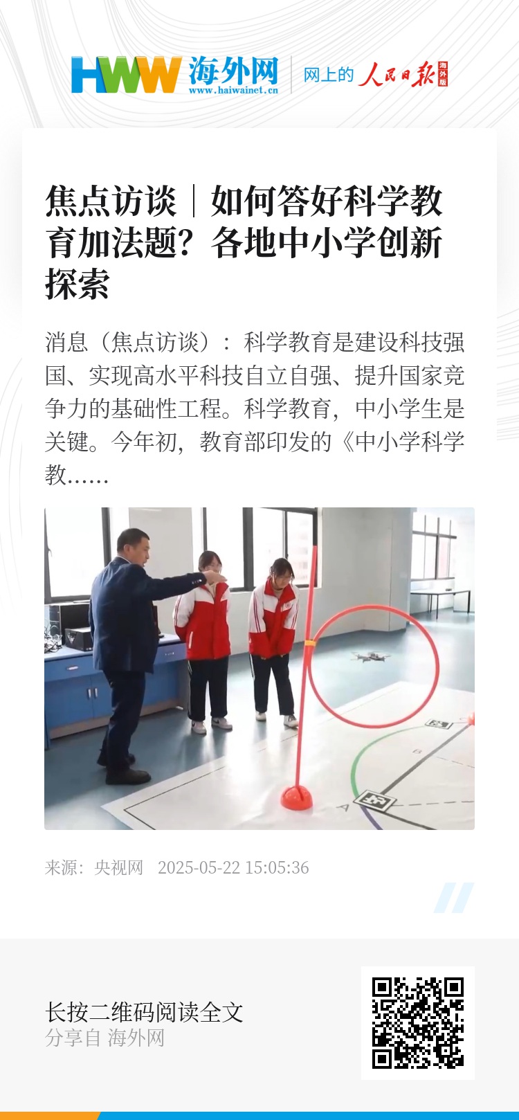 教育部1月统计数据显示,全国56%的省份开设了科学类地方课程,60%的义务教育学校将科学教育活动纳入课后服务。46%的学生每周1—2次进入实验室上课和活动。各地中小学在科学教育中,不断强化跨学科综合教学、动手操作实验和科学探究实践。这些全新的实践,正在重塑青少年的科学认知图景,让更多孩子对科学探究的兴趣被激发。