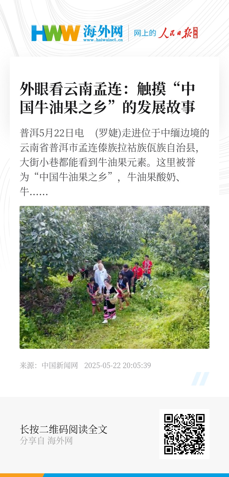 孟连县地处北纬22度,与“世界牛油果之都”墨西哥米却肯州乌拉邦市的气候相似。当地依靠气温和日照资源,种植甘蔗、橡胶、咖啡并发展成为产业,如今这里还成为国内种植规模最大且能够稳定供应高端优质国产牛油果的产区。近日,来自英国、泰国等国家的旅游博主、留学生走进孟连,了解当地产业发展背后的故事。